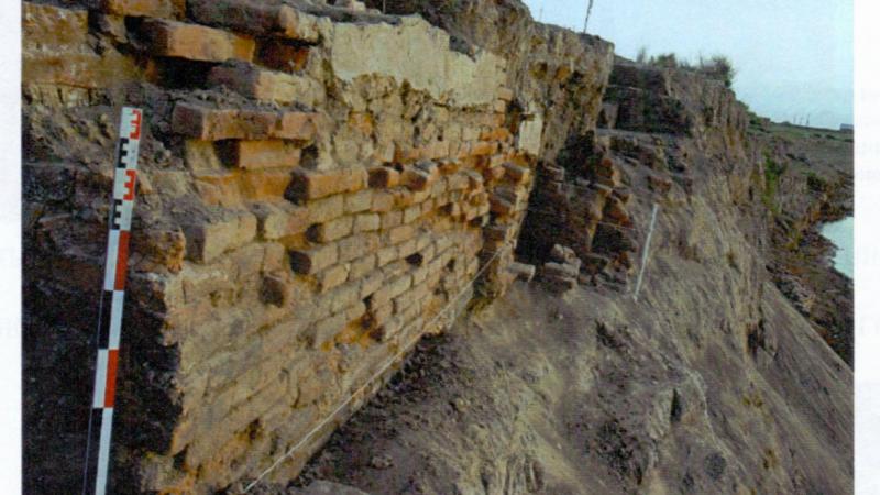 В 2005 гг. были продолжены раскопки по береговой полосе реки Жайык, и были направлены, в первую очередь, на исследования культурных слоев города, разрушаемых водами реки. При обследовании яра правого берега реки Жаик между старой частью и «Опытным полем» с. Сарайчик в юго-западном направлении от раскопа V был обнаружен крупный завал из жженых кирпичей различного формата на площади более 10 м в длину и 5 м в ширину, высотой 1 м. Особенностью завала было наличие фрагментов алебастровой штукатурки. Ряд кирпичей представляли блоки, сцементированные водонепроницаемым раствором, имели алебастровую штукатурку. Наряду с фрагментами керамики были встречены обломки гончарных труб, железного котла. На вертикальном срезе яра просматривалась кладка из обожженного кирпича со следами штукатурки. В связи с этим возникло предположение о наличии в толще культурных напластований монументальной постройки, отличной от часто встречаемых на городище склепов из обожженного кирпича - корхана. С учетом предстоявшего в 2006 году весеннего разлива реки и уничтожением при этом культурных напластований городища было принято решение исследовать прилегающий к выявленной стене участок средневекового города.