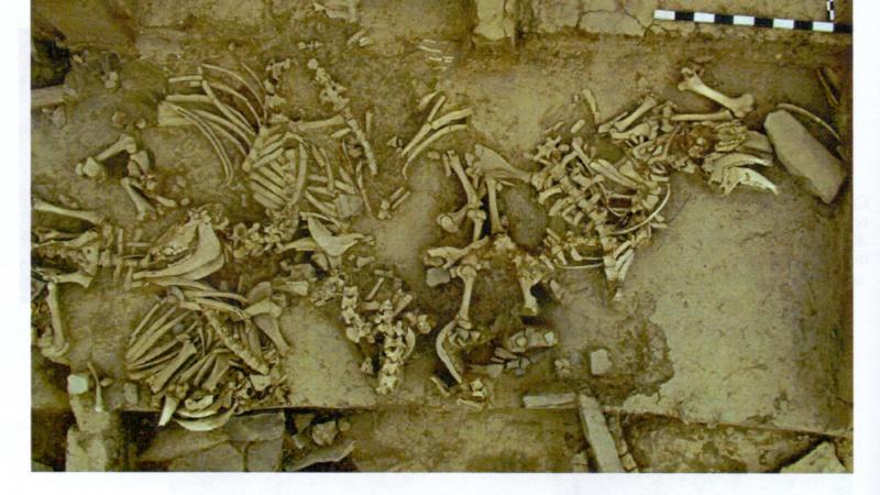 В юго-западном секторе этого квадрата расчищены 2 скелета. 1. Скелет МРС располагался под бровкой между квадратами 310-311. Лежал на левом боку с подогнутыми ногами, черепом на ЗЮЗ. У юго-восточного угла квадрата 311 находилась задняя часть скелета, расчлененного на части: подогнутые кости задних конечностей почти полностью находились под костями КРС (молодой особи), лежавшей севернее. Задний отдел позвоночника лежал по линии юг-север, а около него к западу уложены были лопатка и ребра, под которыми находилась вторая часть позвоночника, вытянутого по линии северо-восток - юго-запад в сторону черепа. К югу лежала нижняя челюсть, принадлежавшая другому скелету, исследованному в прошлом году. К западу от нее лежали остатки верхней части черепа с двумя нижними челюстями. К северу от передней части позвоночника лежали кости передних конечностей в подогнутом состоянии. Кости упирались в череп второго животного, расположенного севернее. 2.Скелет КРС принадлежал, видимо, молодой особи, также разделенной на части: к западу лежал череп, за ним позвоночник с ребрами (7-8), в задней его части располагались лопатки - одна лежала на нем, другая под ним с северной стороны. Под верхней лопаткой найдены остальные ребра, верхними концами лежавшие на позвоночнике (правая сторона скелета). К северу лежали кости передних конечностей, к северо-востоку - задних. Таким образом, в течение полевых сезонов 2005-2006 гг. исследовалась северная жертвенная площадка, выявленная в пределах квадратов Ж10-З10- И10-ЕІ1-Ж11-311. В данном случае мы имеем дело с жертвой оставления жилища-мастерской в связи с прекращением металлургического производства. Характер расположения костей и культурных остатков указывает на невозможность дальнейшего функционирования комплекса, т.к. жертвы располагались в слое, непосредственно перекрывающем пол жилища-мастерской и металлургические комплексы. Принесенными жертвами были не только животные и, вероятно, люди, но и орудия труда и посуда. Среди костей животных довольно многочисленны костяные изделия - тупики, серповидные орудия, проколки, шпатели и каменные орудия - ступки, наковальни, песты, молоты и т.д.