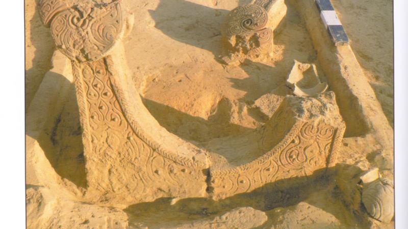 В другом помещении в южном секторе раскопа обнаружен очаг под прямоугольной формы размером 2,16x1 м. Внутри очага, рядом с южной стенкой найден полуразрушенный глиняный алтарь с изображениями двух бараньих голов, покрытый пышной резьбой и налепными шишечками. Ближайшие аналогии, это изделие находит в подъемном материале с городища Кескен - Куюк - Кала, опубликованном Л.М. Левиной и отнесенном к джетыасарской культуре.