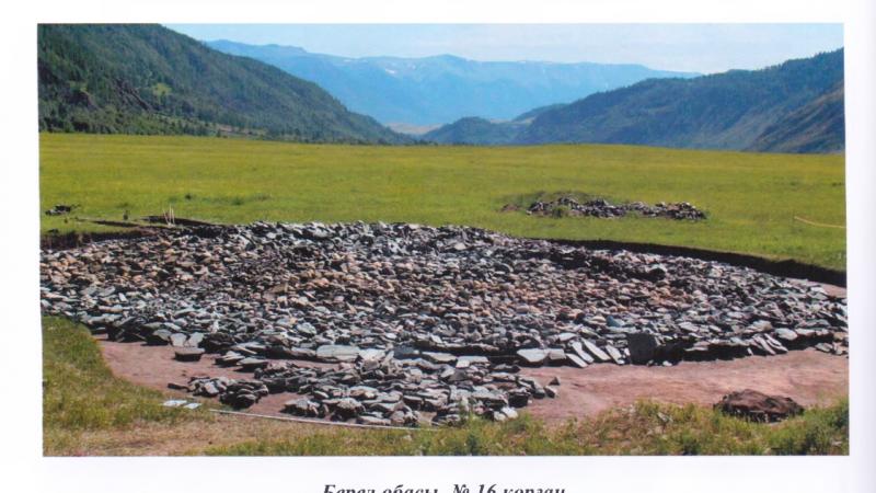 За отчетный период исследовался курган № 16 и прилегающие к нему объекты, получившие обозначения №№ 16 А, 16Ви16Си составляющие с ним единый археологический комплекс. Курган № 16 расположен в ряду объектов, вытянутом параллельно цепочке, в которой расположены Большой берельский курган, курганы с мерзлотой №№ 11, 9, 10. В этом же ряду находятся курганы №№ 18 и 17. Отметим, что курган № 18 был раскопан в 1998 г. и соединялся дорожкой, выложенной из камня, с курганом № 16. Поскольку исследования последних 10 лет были в основном сконцентрированы на цепочке объектов с курганами №№ 4, 9-11,36, 71-74, то для сравнения особенностей погребального обряда и архитектуры наземных сооружений разных цепочек возникла необходимость продолжения раскопок курганов в другом, параллельном, ряду.
