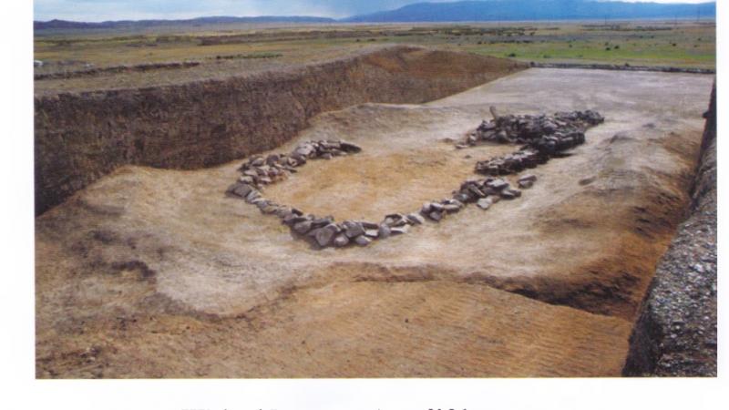 На глубине 3 м 10 см в слое дерна обнаружен остаток дерева диаметром 15 см, установленный вертикально. А в 10 см ниже дерева в северо-западной части обнаружена стела, расположенная также по вертикали. Длина четырехгранной стелы составляет 1м 20см. Ниже камней был обнаружен подковообразный по форме земляной вал, сооруженный из суглинистой, плотно утрамбованной земли. Дальнейшие раскопки показали, что грунтовый вал окружал могильную яму и дромос. Вал построен из грунта, вынесенного из могильной ямы и дромоса. Подковообразная форма вала, открытая часть которой направлена на восток, по нашему мнению, имела мировоззренческую основу.